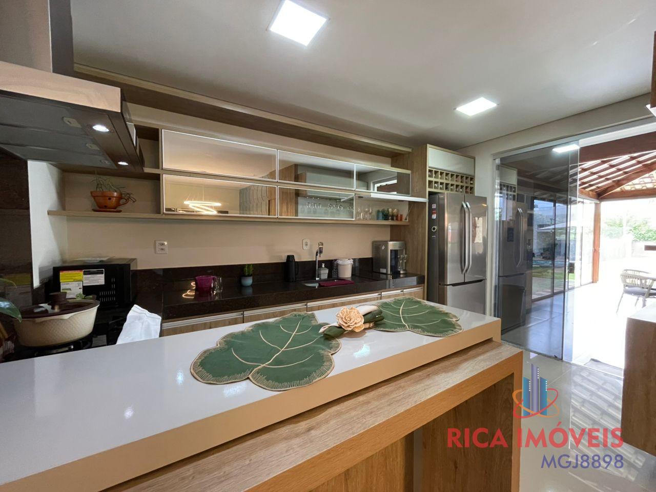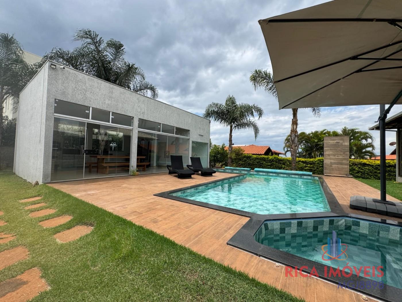 Casa linear de 04 qtos sendo uma suíte com banheira de hidromassagem, sala ampla conjugada com cozinha, 01 lavabo, varanda ampla com portas de correr, lavanderia fechada, cozinha gourmet, piscina aquecida de aproximadamente 50.000 litros, sauna elétrica, jardim gramado e pomar.